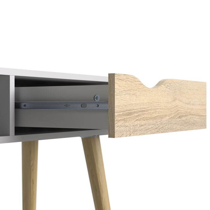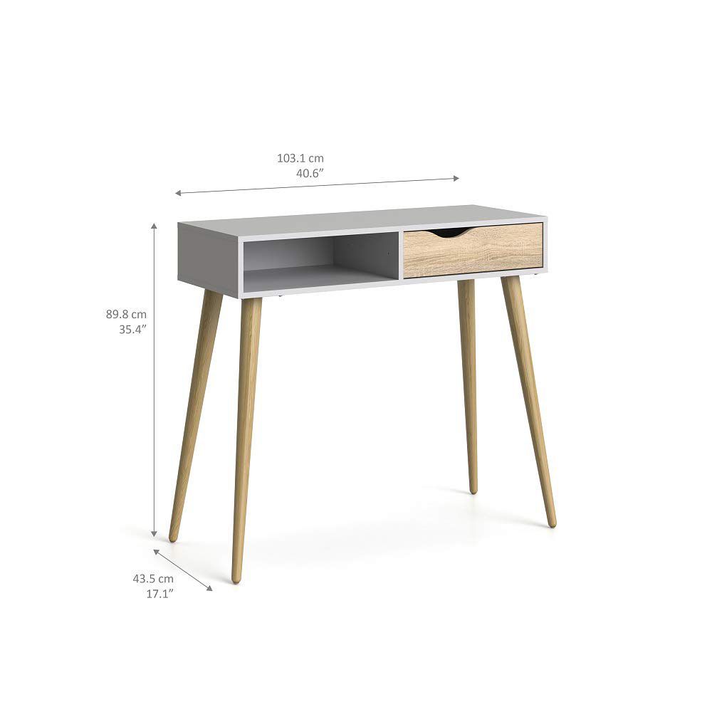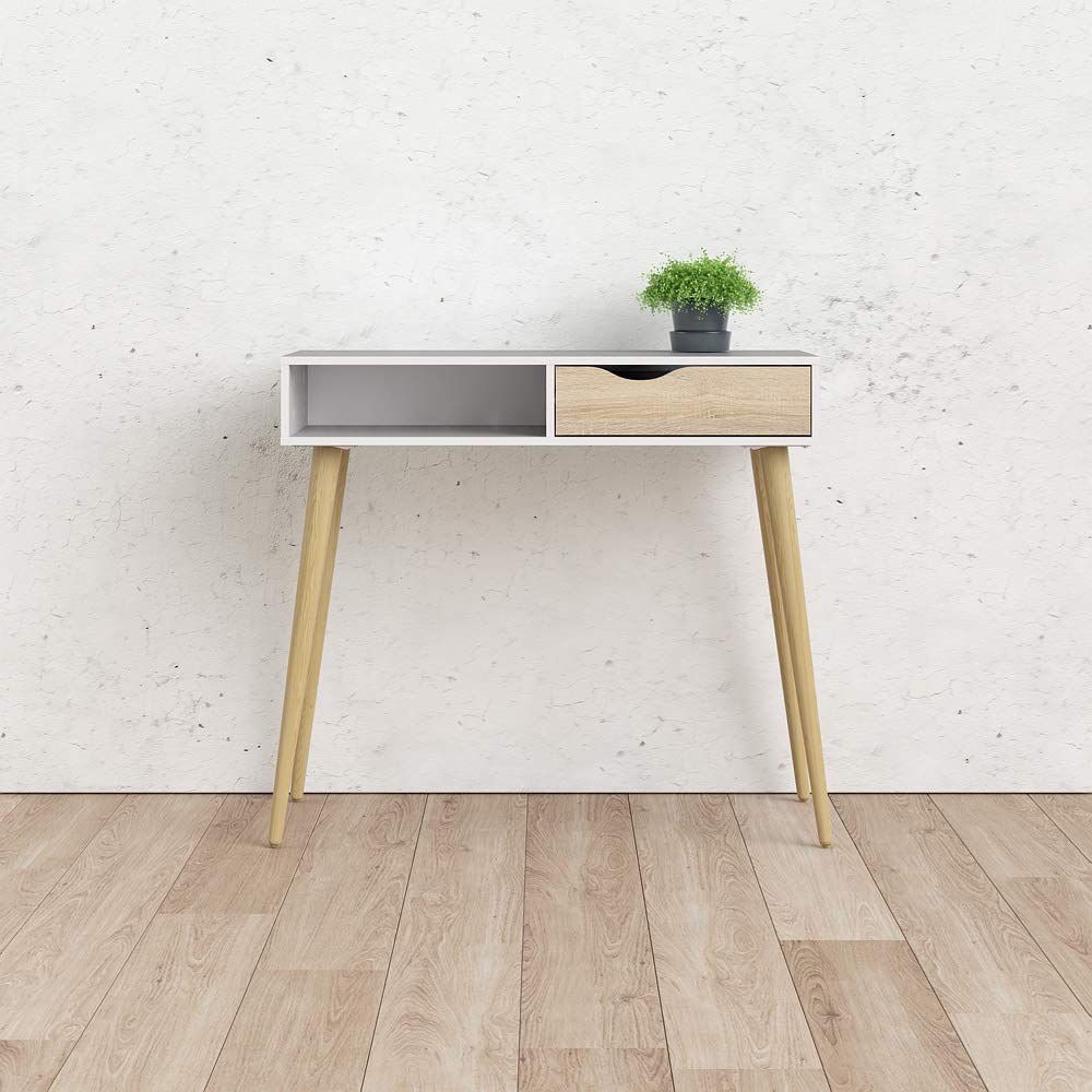 طاولة كونسول أنيقة بتصميم اسكندنافي بسيط وعصري، بسطح أبيض ولمسات من خشب البلوط الطبيعي (Oak). تحتوي على درج واحد ورف مفتوح لتخزين المفاتيح أو الدفاتر أو الزينة، وتُعد مناسبة لمداخل المنازل أو غرف المعيشة. سطحها مقاوم للخدوش والرطوبة وسهل التجميع في المنزل.