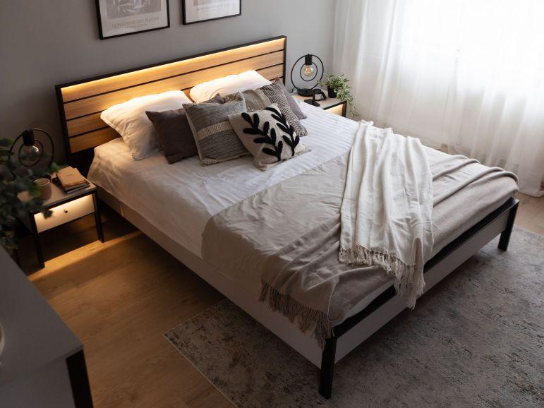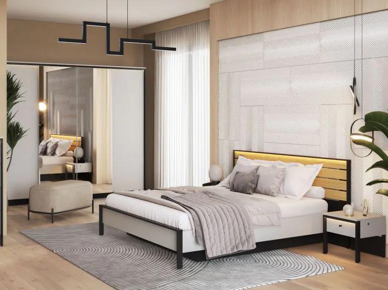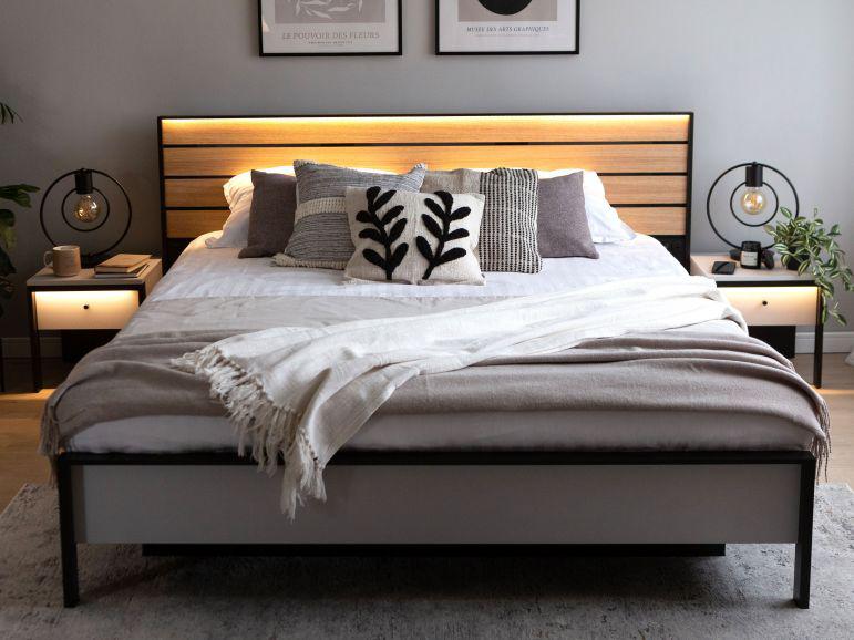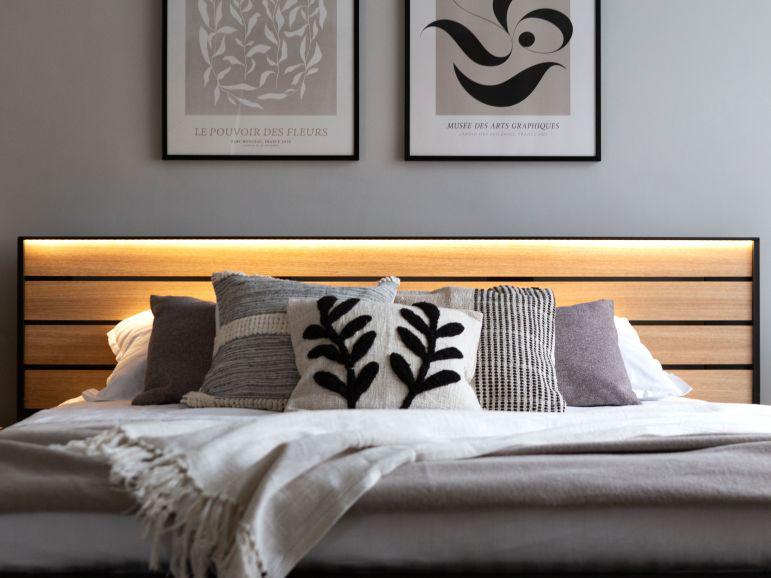 إضاءة مدمجة: إضاءة LED هادئة في السرير والطاولات الجانبية لخلق أجواء مثالية.
