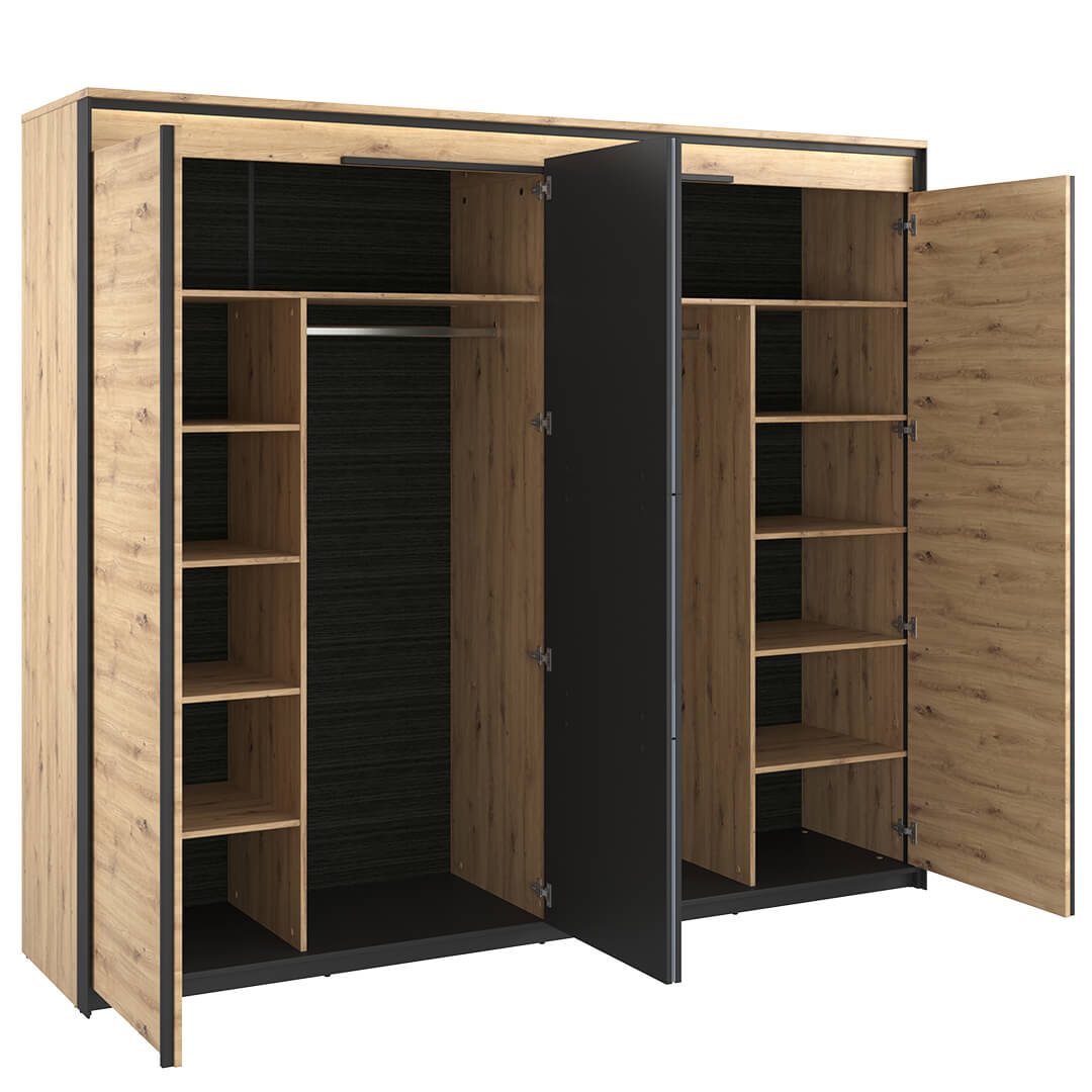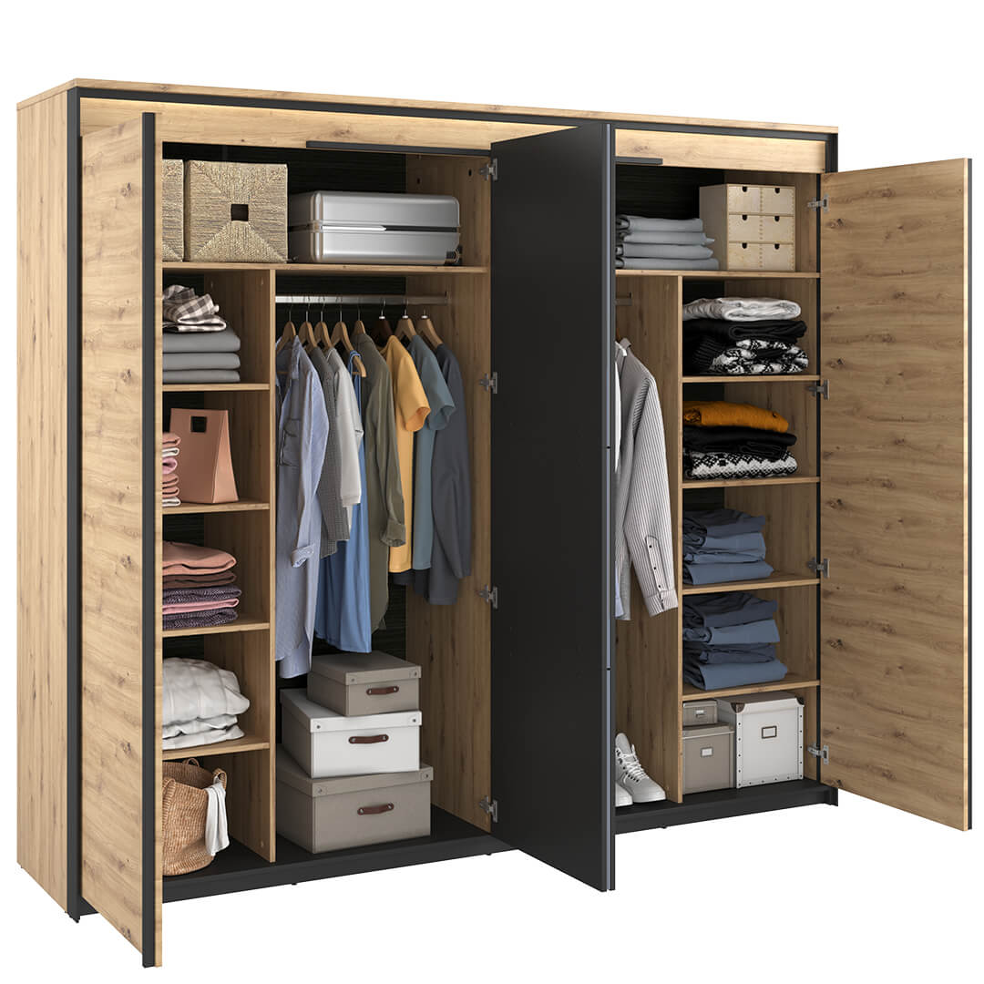 أما الخزانة الكبيرة فتوفر مساحة مثالية بتنظيم داخلي مدروس، قضبان لتعليق الملابس، رفوف متعددة، ومرآة أمامية تعكس الإضاءة وتمنح الغرفة رحابة وأناقة إضافية.