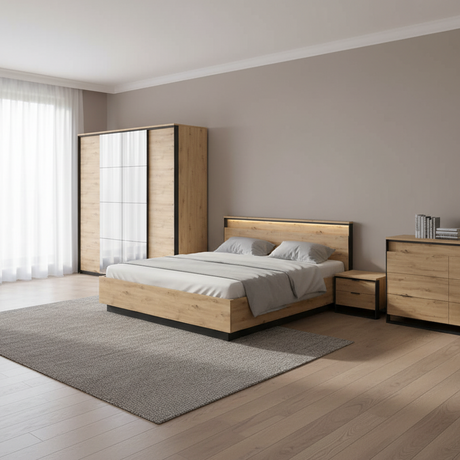 تتكون من سرير مريح بتصميم حديث، كومودينو أنيق بدرجين مع إضاءة LED لجو دافئ، وخزانة أدراج بثلاثة أدراج واسعة لتخزين الملابس والأغراض.