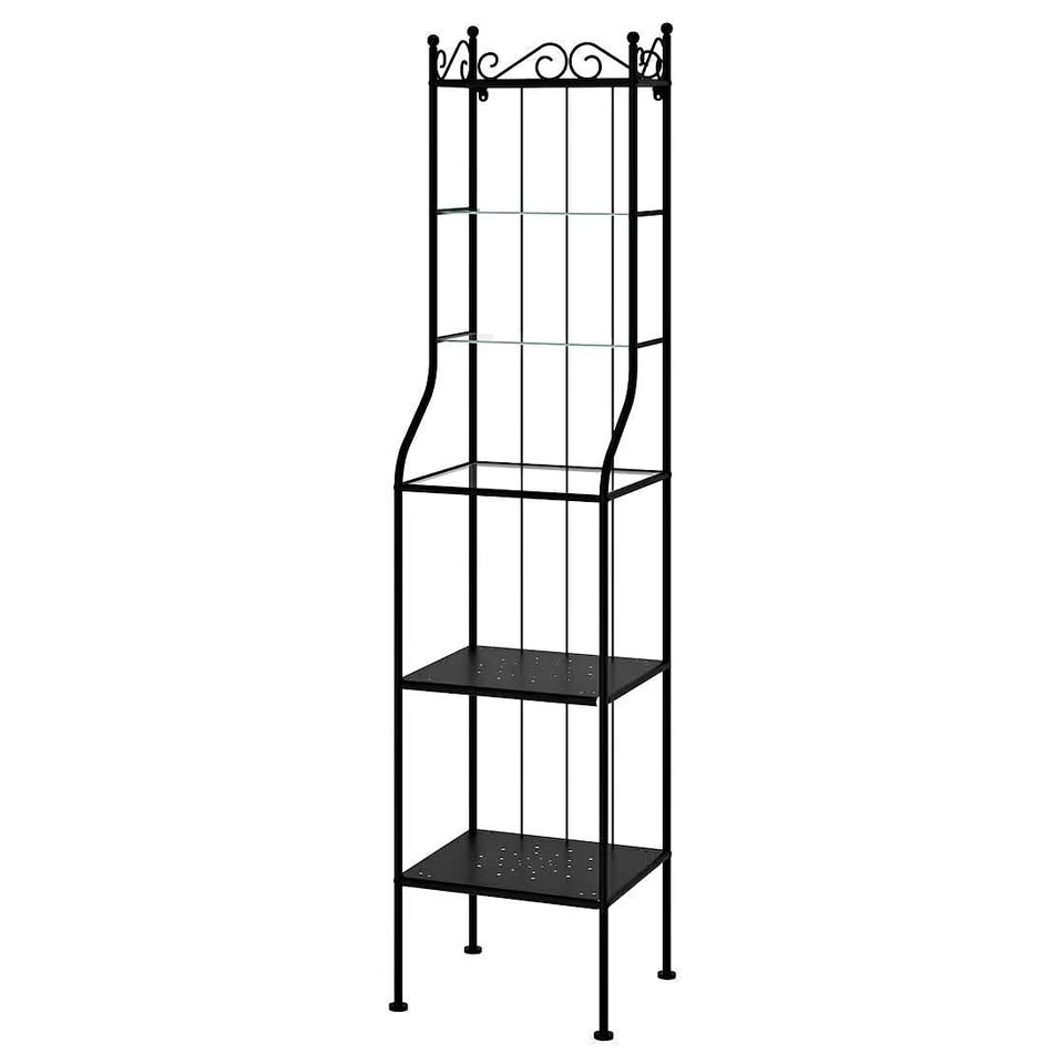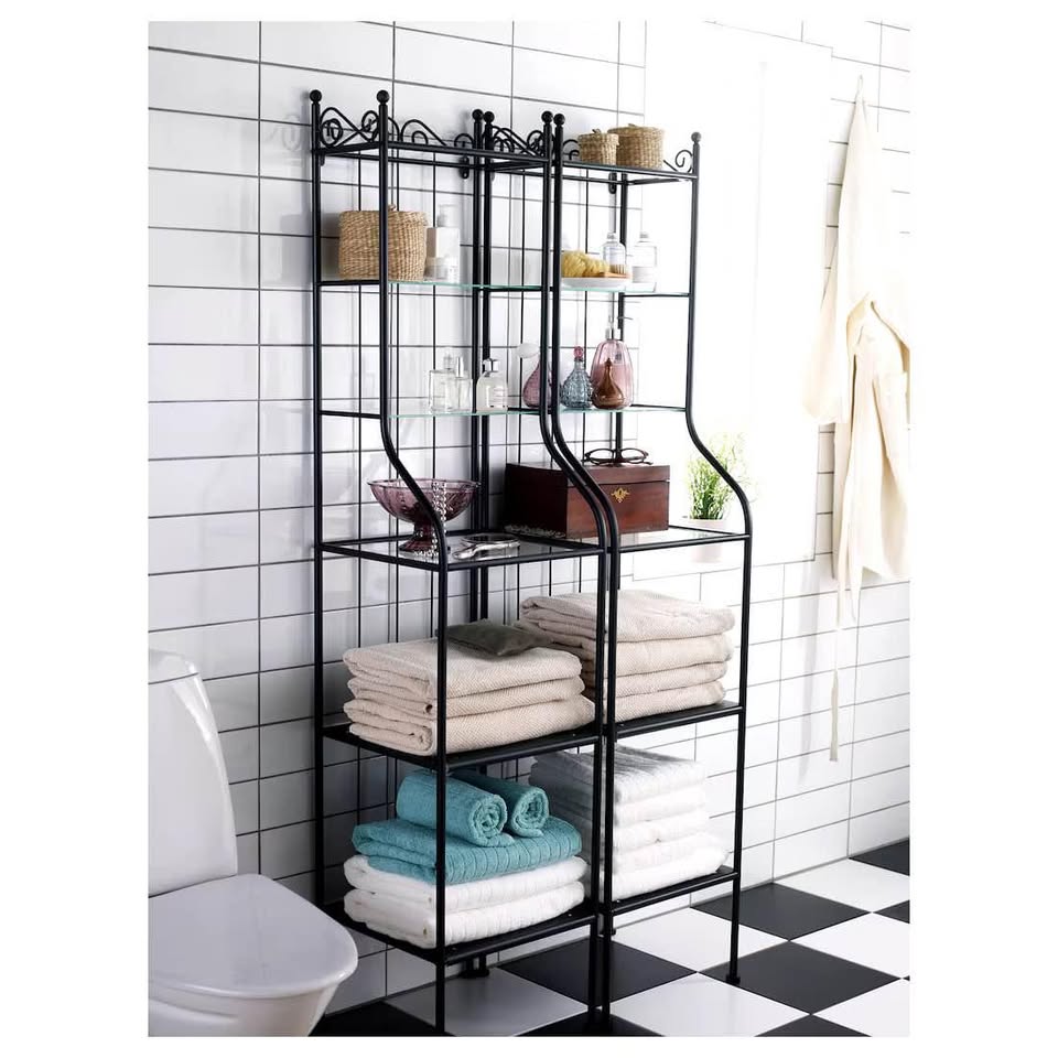 وحدة رفوف أنيقة ومناسبة للحمّام، مصنوعة من الفولاذ والزجاج المقسّى مع رفوف قابلة للإزالة، سهلة التنظيف وتوفر مساحة ممتازة لتخزين المناشف ومستحضرات التجميل.
